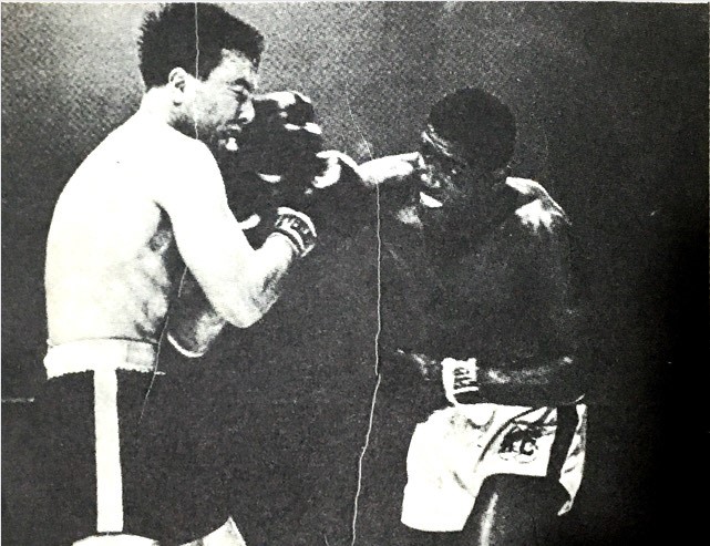 Sağdaki ağzındaki diş koruyucusu gören boksör rakibinin savunmasını şiddetli bir sağ kroşe ile açmış durumda.
